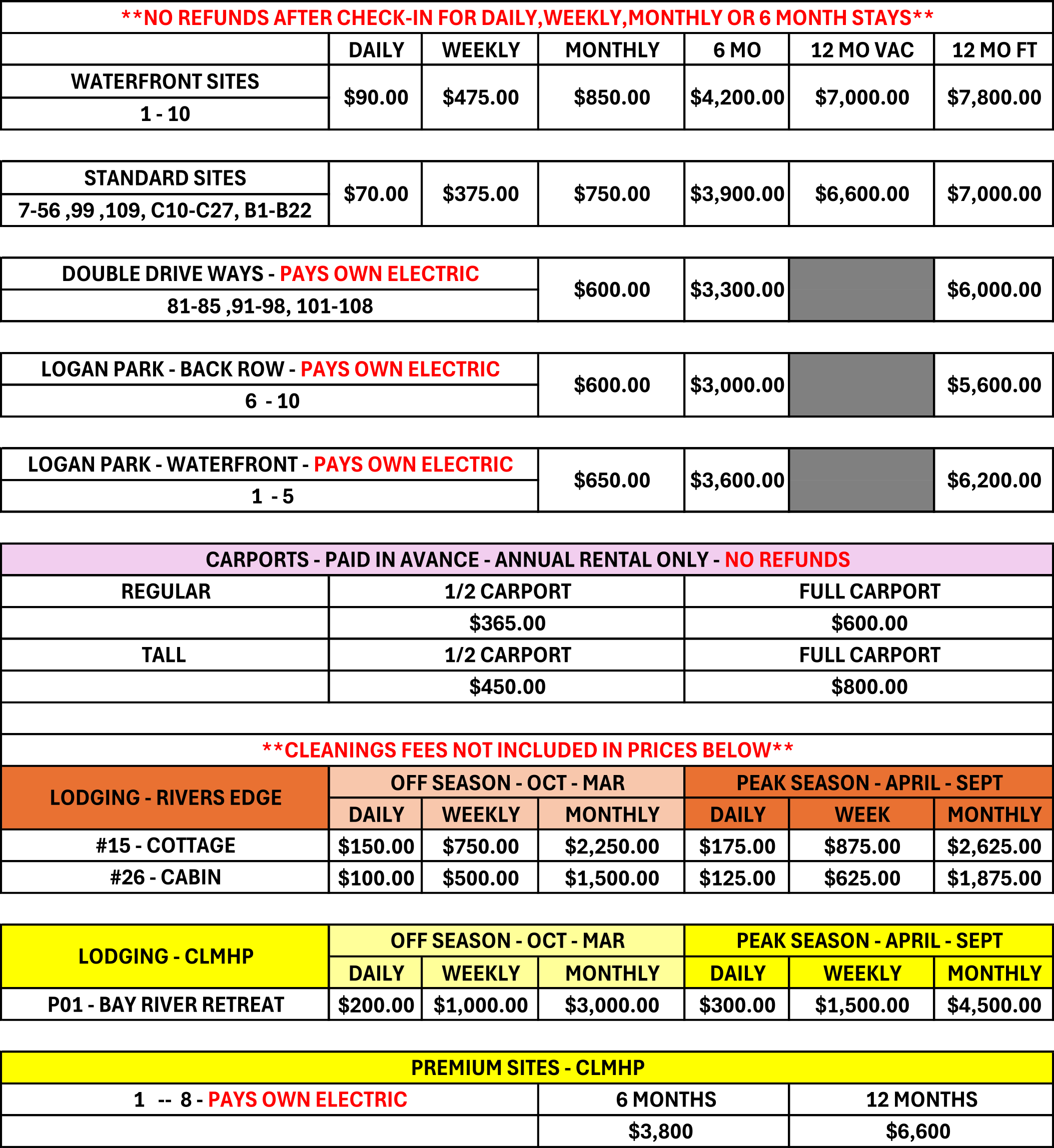 - The refund will be figured at the regular monthly rate based on the site you were staying at, any partial month will be calculated at ½ of the campground nightly rate, early departure fee of $400 and the remaining balance, if any, will be refunded.